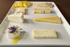 Abbiamo iniziato con la degustazione dal Routlin, fresco caprino a latte vaccino servito con una goccia di olio EVO DOP e dei petali di fiordaliso che pur non fornendo alcun contributo aromatico hanno dato una romantica cornice estetica al formaggio.