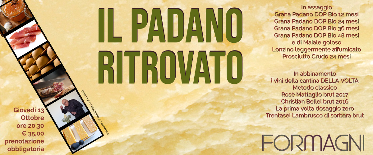 Amici di Formagni,ecco il prossimo evento fissato il giorno 13 ottobre. Ce l'abbiamo fatta, lo abbiamo ritrovato. Il Padano Grana Padano DOP., il formaggio italiano più venduto al mondo, anzi il formaggio in assoluto più venduto al mondo, ve lo proponiamo in 4 stagionature in abbinamento con i  vini della Cantina Della Volta, ma non […]
