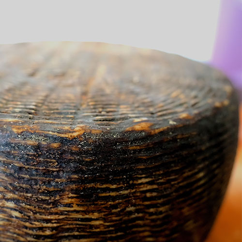Aspetto: crosta rugosa, dura, leggermente untuosa, color marrone non uniforme con screziature color crema, marrone chiaro, grigio scuro.